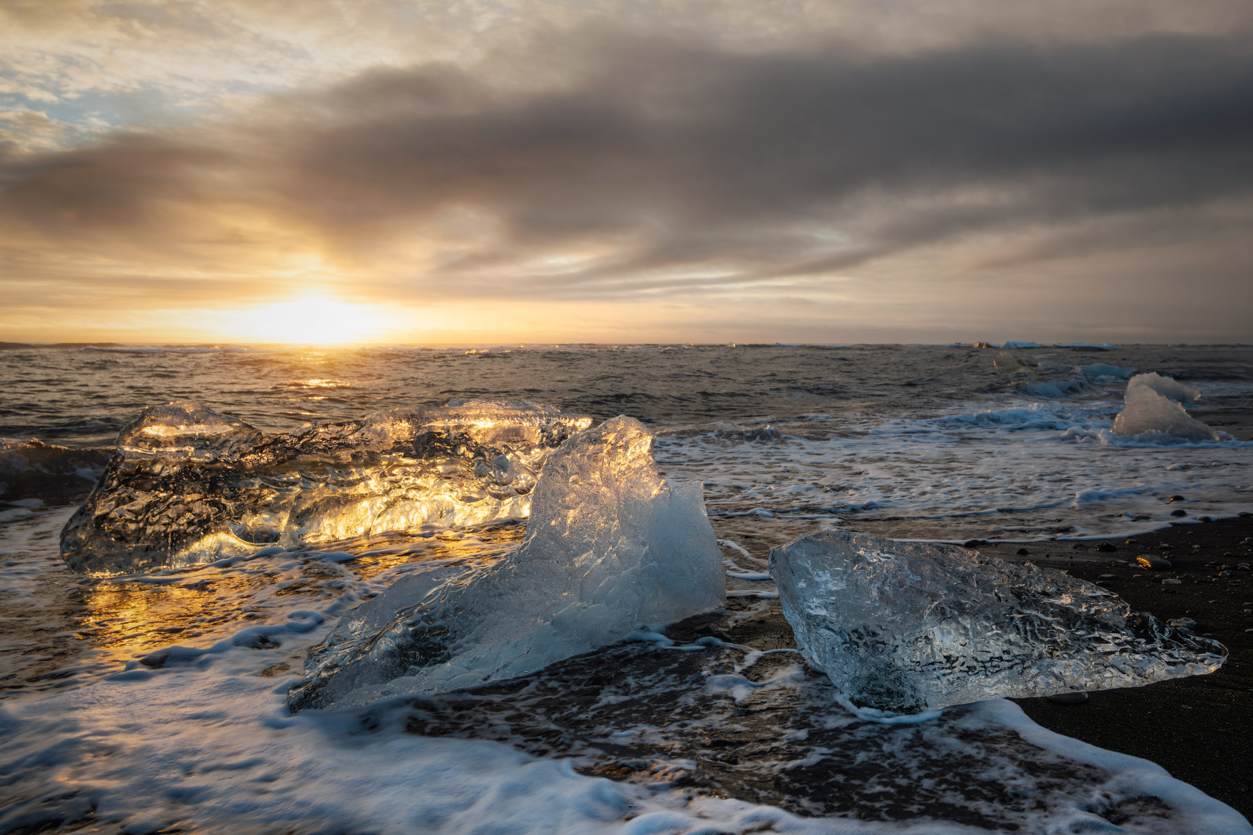 Diamond Beach in Iceland at sunset with glowing ice on the shore and ocean waves in the background