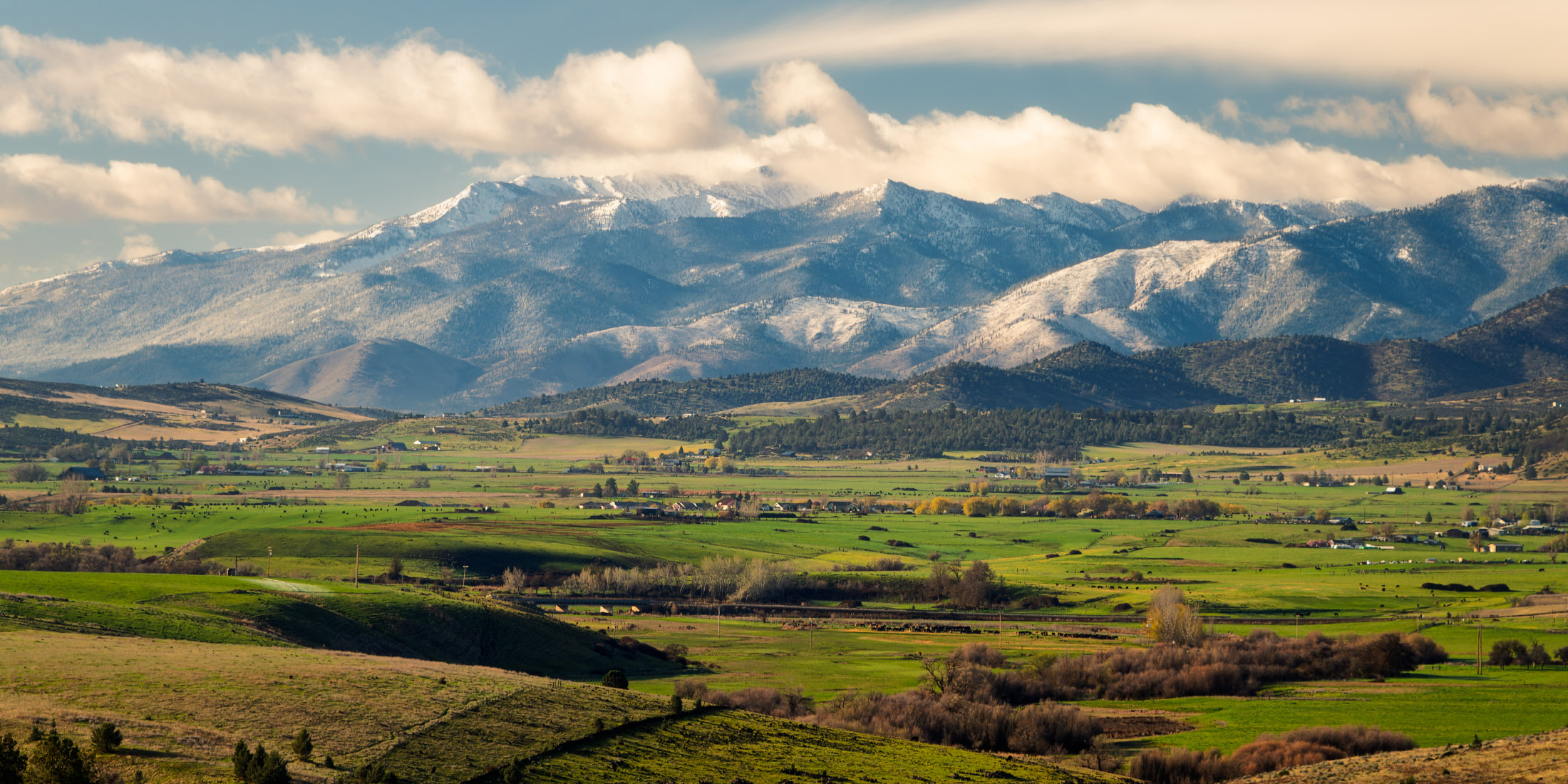 Shasta Cascade region in Northern California with broad valley and snow-covered mountain range