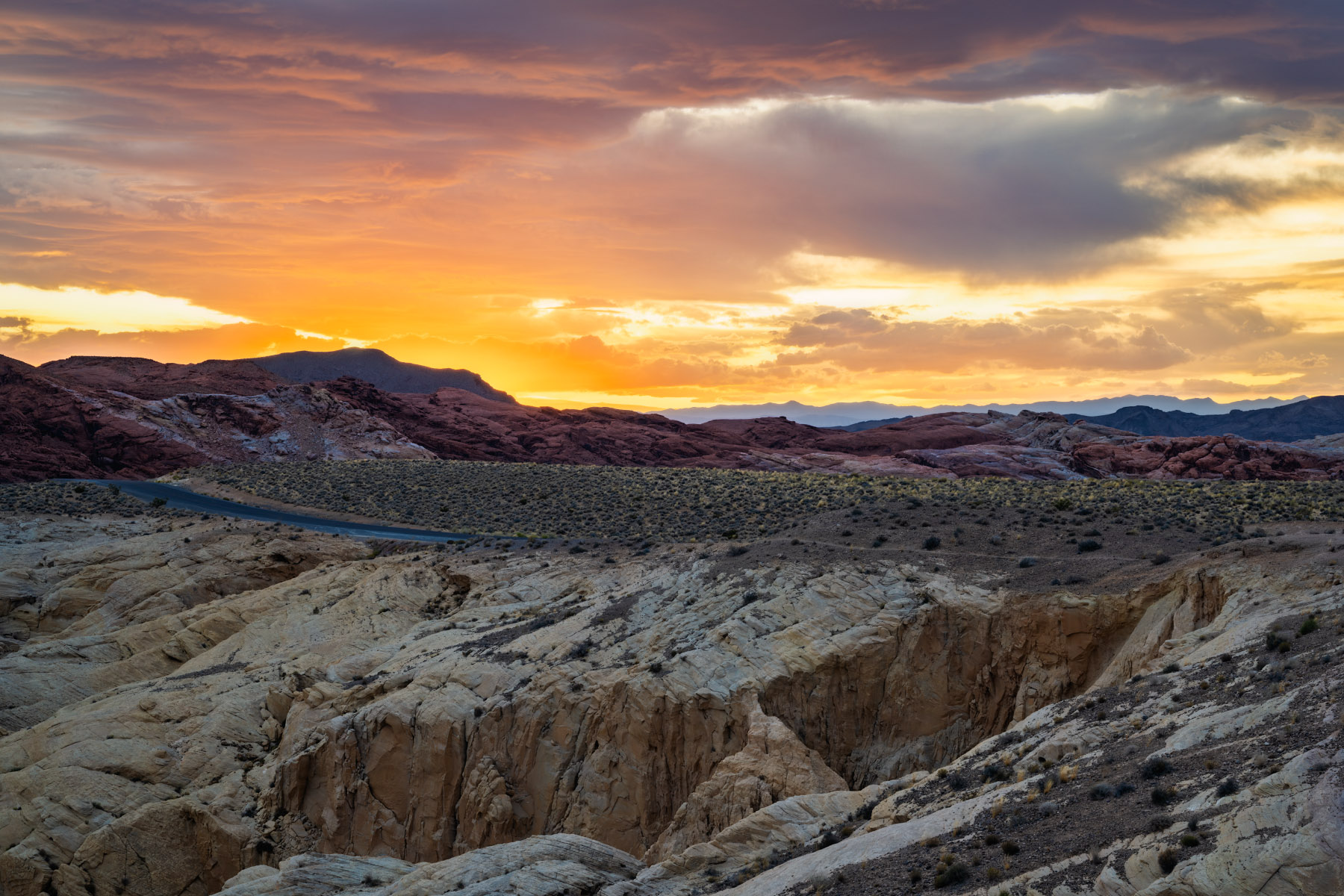 Valley of Fire State Park in Nevada with winding road through sandstone hills at sunset